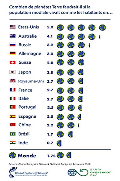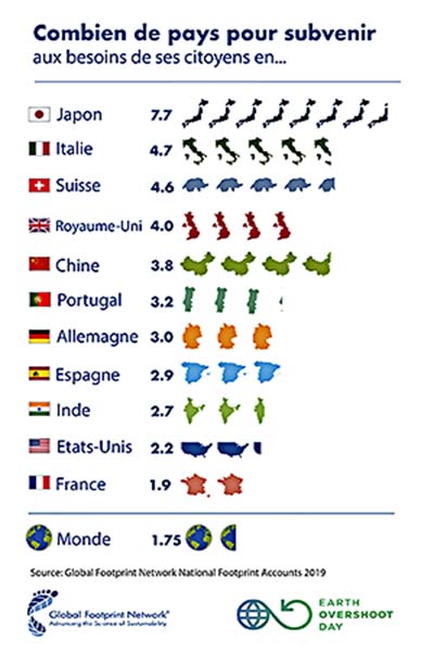 Par ailleurs, si la population mondiale vivait comme les Canadiens, nous aurions besoin de 4,8 planètes Terre pour soutenir sa consommation et de cinq si elle suivait le même rythme que les Américains. Aussi, pour subvenir aux besoins de ses citoyens, le Japon aurait besoin de se multiplier par 7,7.